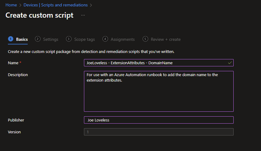A walkthrough for automating the tagging of Entra Device Extension Attributes with Intune Remediation Scripts and Azure Automation Runbooks.