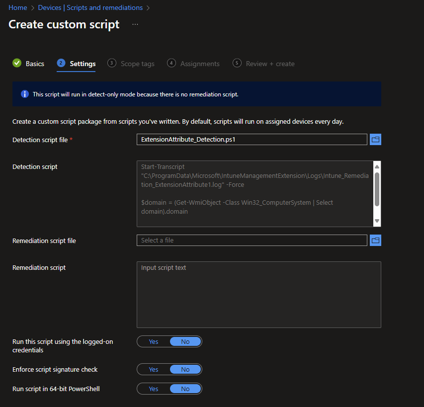 First we will setup the Intune Remediation Script. For this, we are only going to be using a Detection method, as we're just looking to read data on the device.